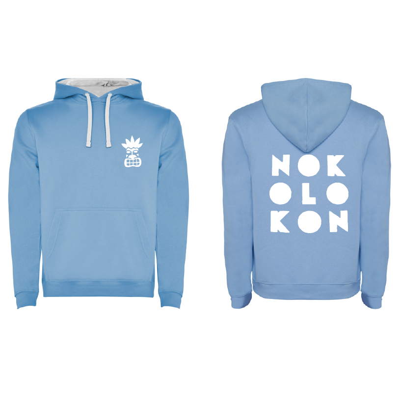 bicolor. Cubrecosturas en el cuello y bolsillo canguro. Punto canalé con